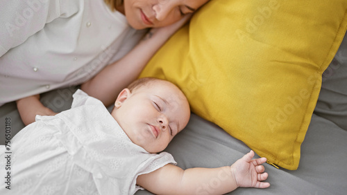 Mother and daughter sharing a loving moment lying together on bed, sleeping in the warm comfort of their home bedroom. exhausted from a lovely day full of family laughter and childhood joy.