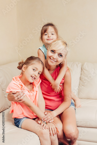 Mother and daughters girls kids at home spending time together. Parent playing with children. Family having fun hugging and laughing. Real people lifestyle. Mothers day holiday concept.