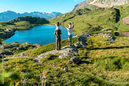 Mother and father carrying daughters on shoulders looking at view while standing during sunny day