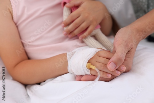 Mother and her little daughter with IV drip on bed in hospital, closeup