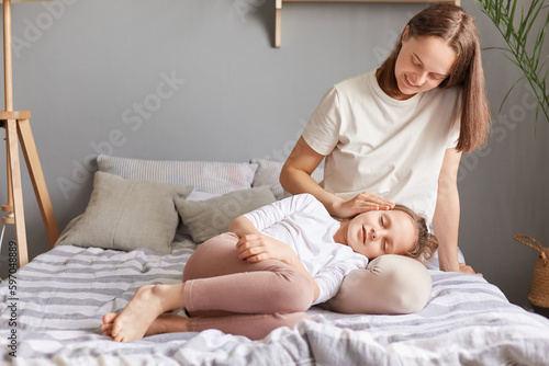 Mother and little daughter child relaxing laying on bed at home in bedroom, sleeping indoors, family generations enjoying time together, vacation leisure loving care child falling asleep.