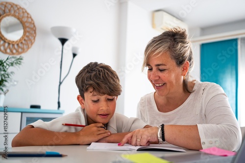 Mother and son are focused on a homework task at a table in a well-lit room. The adult is helping the child with schoolwork, promoting learning and connection.