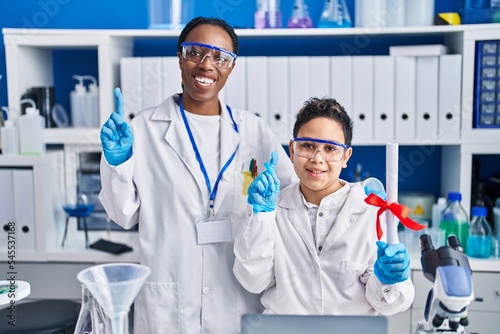 Mother and son at scientist laboratory smiling with an idea or question pointing finger with happy face, number one