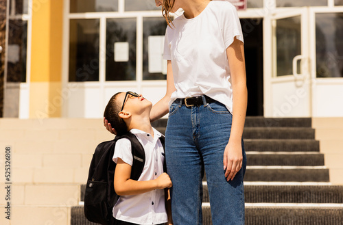 Mother and son in front of the school on a sunny morning waiting for the first lesson to start.