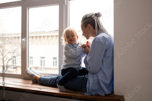 Mother and son sitting on sill near window