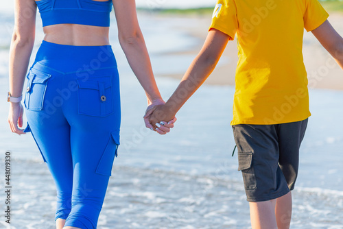 Mother and son walking on the beach at the summer day time.boy hold mother hand stand near waves.Back view.