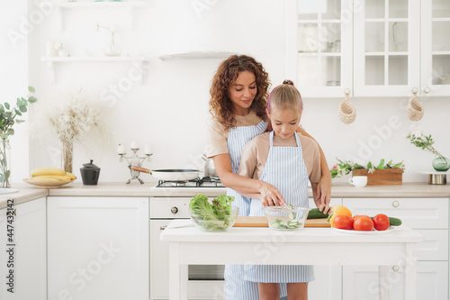 Mother and teen daughter preparing vegetable salad at kitchen