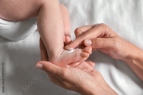 Mother applying moisturizing cream onto baby`s foot on bed, top view
