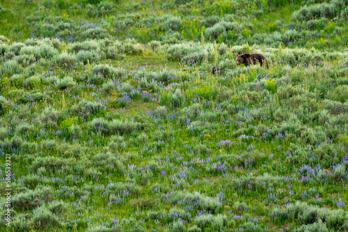 Mother Bear and Cubs Graze In Field of Lupine