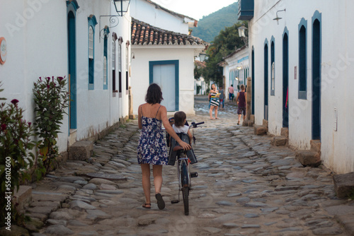mother carrying baby on bicycle through the streets of the historic center of paraty, rio de janeiro