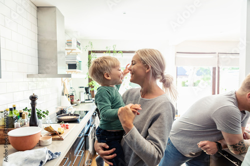 Mother carrying son while father leaning behind in kitchen