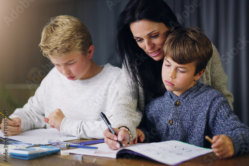 Mother, children and helping with school homework in house or learning education, teaching or lesson. Woman, sons and table in apartment for student knowledge or academic studying, writing or project