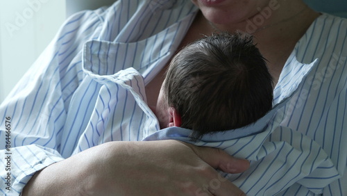 Mother Cradling Her Newborn Baby in a Hospital Room. The Baby, Wrapped in a Striped Shirt, Sleeps Peacefully, Reveling in the Warmth and Comfort of Skin-to-Skin Contact