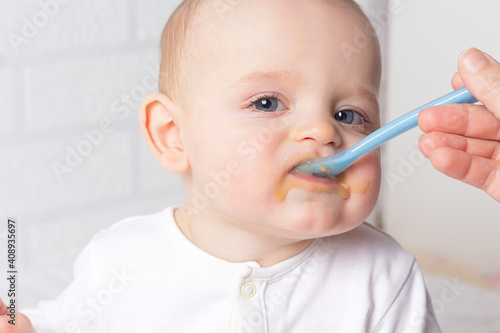 Mother feeding baby with blue baby spoon. First baby fruit puree. Close up photo of caucasian baby boy. Child learning to eat.