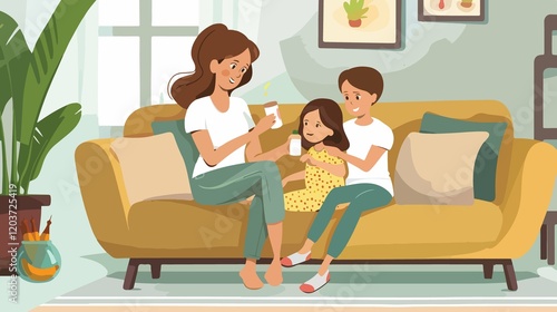 Mother Giving Daughter Cough Syrup on Sofa at Home - Care and Love Scene