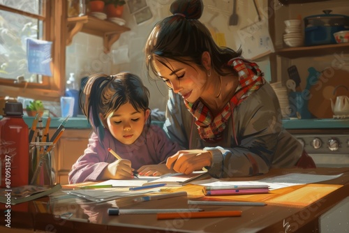 Mother Helping Child with Homework at Kitchen Table - Educational and Family Bonding Concept