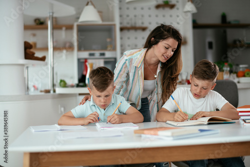 Mother helping her son with homework at home. Little boy learning at home.