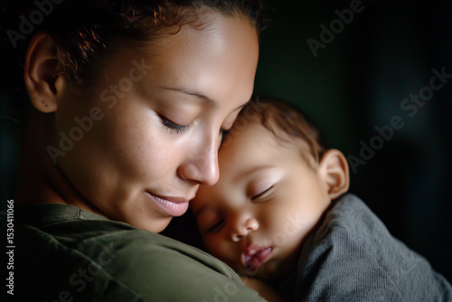 Mother holding sleeping baby in low light, calm emotional moment, earthy colors, shadows defining emotional expression,