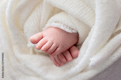 mother holds the feet of the newborn baby with her hands, fingers on the foot, maternal care, love and family hugs, tenderness.