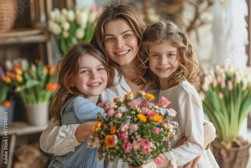 Mother is having a happy Mother's Day children surprising her and giving bouquets and gifts.