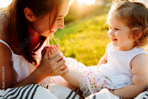 Mother kisses baby girl's feet on the blanket in the park and sunset.