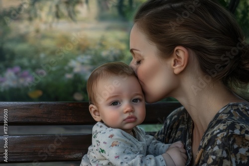 Mother kissing her baby on a bench surrounded by flowers in a serene garden during golden hour