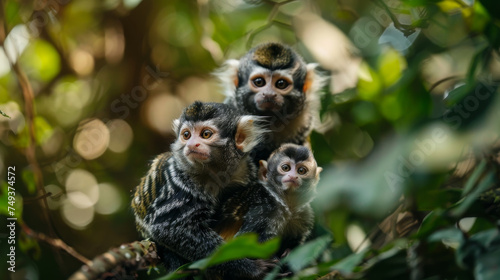 Mother marmoset cuddling her babies in the forest, with a focus on their close bond.