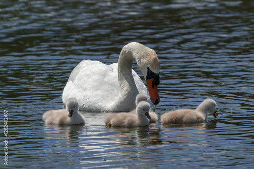 Mother mute swan (Cygnus olor) with four several days old cygnets, in the river. Sunny spring day. France, Europe