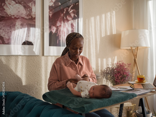 Mother putting on socks on baby
