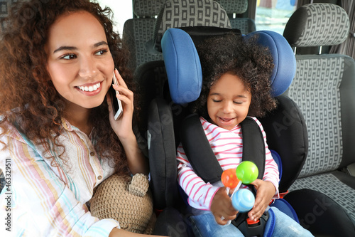 Mother talking by mobile phone and her little daughter fastened in car safety seat