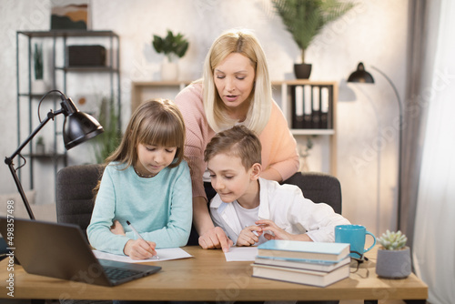 Mother teach young son and daughter homework, using digital laptop at home. E-learning lifestyle, happy family homeschooling, children remote distance education, or internet technology concept
