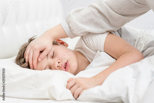 Mother touches the forehead of the child, checking the temperature