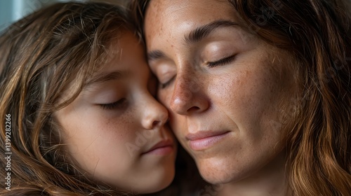 Mother’s Day: Close-up of a mother and daughter with eyes closed, freckled skin, and brown hair, sharing a tender moment of connection and love.