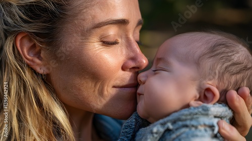 Mother’s Day: Tender moment: a mother gently holds her baby, their faces close, eyes closed in a serene display of affection and connection. Sunlight illuminates them.