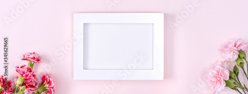 Mother's Day, Valentine's Day background design concept, beautiful pink, red carnation flower bouquet on pink table, top view, flat lay, copy space.