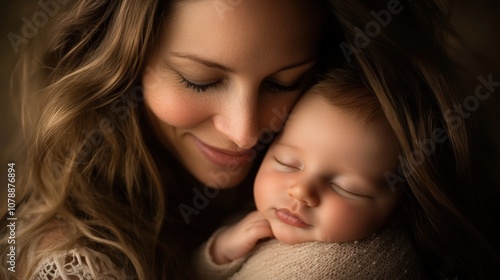 Mothers Love, Newborn Sleep, Soft Embrace, Tender Gaze, CloseUp Portrait