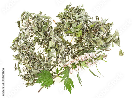 Motherwort plant on a white background, top view. Heap of dried and fresh plant.