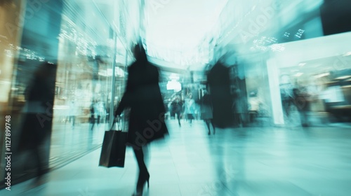 Motion blurred shopper with shopping bags walking in shopping mall in big city street.