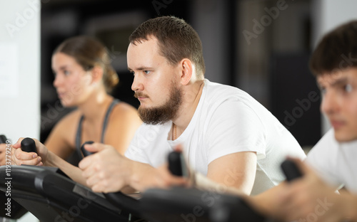 Motivated man works out on an exercise bike during a group workout in the gym. European at cardio training in a fitness club
