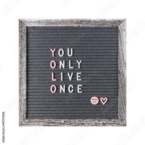 Motivation text, You Only Live Once, on letters grey vintage board isolated on white background.