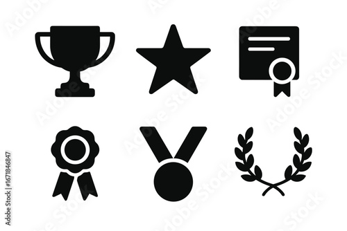 Motivational Icon Set with Trophy, Star, Certificate, Ribbon, Medal, Laurel Wreath, Solid Filled Vector Illustration of Achievement and Success Symbols on Transparent Background