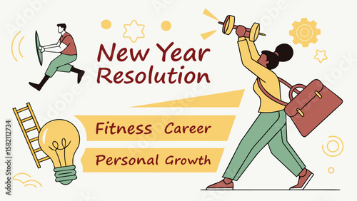 Motivational New Year Resolution Illustration: A woman celebrates fitness goals while a man pursues career advancement, symbolizing personal growth and achieving ambitious objectives in the new year.