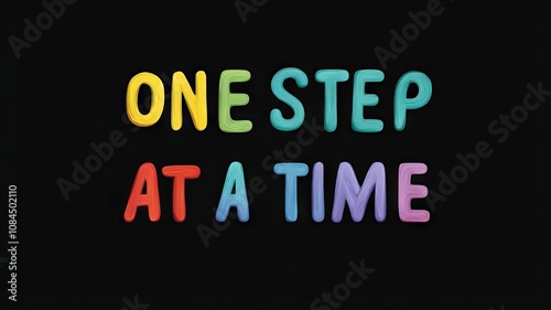 Motivational phrase “One step at a time” on a black background written in cheerful colorful letters