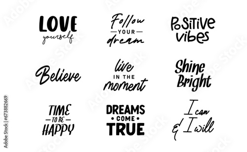 Motivational quotes. Set of positive vibes messages. Love yourself, be grateful, live the moment.