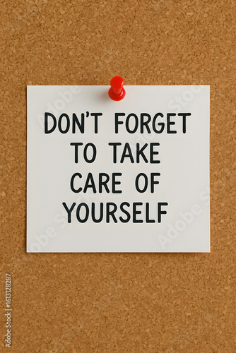 Motivational reminder note with text don’t forget to take care of yourself pinned on cork board, mental health awareness concept, positive affirmation message, self care lifestyle, mindfulness wellnes