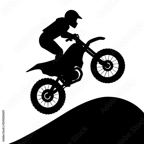 Motocross bike jumping over a hill, simple vector silhouette on white background