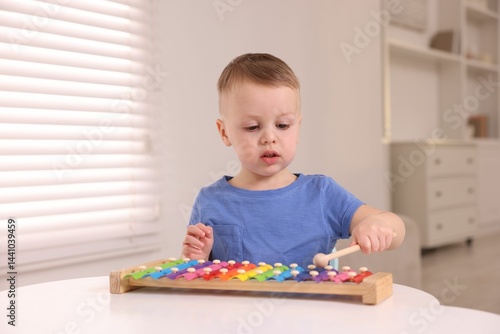 Motor skills development. Little boy playing with xylophone at white table indoors