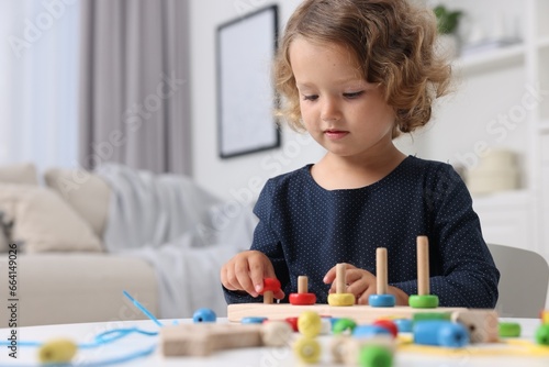Motor skills development. Little girl playing with stacking and counting game at table indoors
