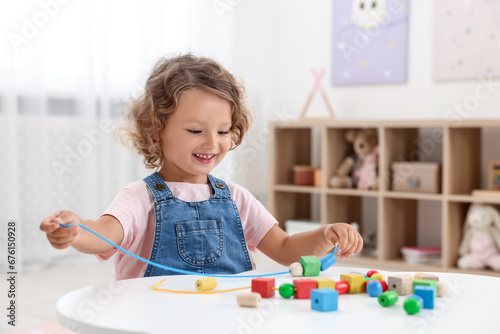 Motor skills development. Little girl playing with wooden pieces and string for threading activity at table indoors