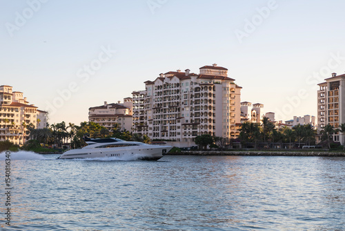 Motorboat passing Fisher island, Miami. Miami architecture, Florida. Luxury yacht boat at Fisher island. Summer vacation. Travel destination. Fisher island residential building and luxury yacht boat